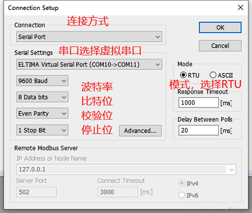 端口主從機(jī)分別選擇我們虛擬出來的com10和com11端口,其他選項(xiàng)如波特率9600,比特位8,校驗(yàn)位1,無等價(jià)位等可以保持不變,然后點(diǎn)擊確定進(jìn)行連接,未連接成功窗口第二行會(huì)給出提示信息。