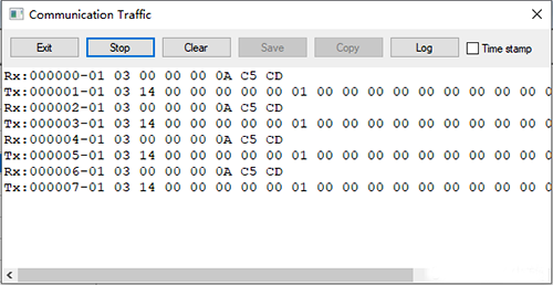 點(diǎn)擊“Display”----“Communicatio”,可以調(diào)出串口收發(fā)數(shù)據(jù)幀監(jiān)視信息對話框,用來查看分析收發(fā)的數(shù)據(jù)幀。如下圖所示: