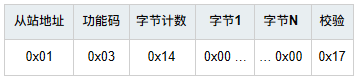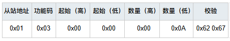 0x00 0x0A:查詢的寄存器數(shù)量為0x000A(10)個(gè) Modbus把數(shù)據(jù)存放在寄存器中,通過查詢寄存器來得到不同變量的值,一個(gè)寄存器地址對應(yīng)2字節(jié)數(shù)據(jù); 寄存器地址對應(yīng)著從機(jī)實(shí)際的存儲(chǔ)地址