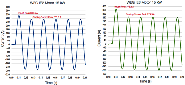 以15kW電動(dòng)機(jī)為例,IE2電動(dòng)機(jī)的沖擊電流峰值309.5A,起動(dòng)電流峰值為265.8A,而IE3電動(dòng)機(jī)的沖擊電流峰值為373.3A,起動(dòng)電流峰值為275.5A,無論是沖擊電流還是起動(dòng)電流,IE3都比IE2電機(jī)高。