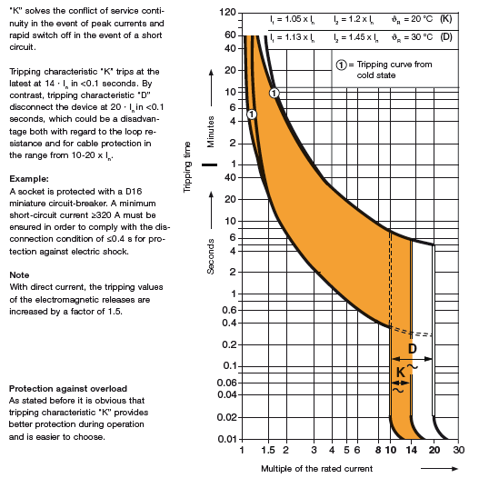 最大的差異在過載保護區(qū)域,D型微斷同B、C型一樣都需要滿足1.13In一小時內(nèi)不動作,1.45In一小時內(nèi)必定動作的要求;而K型微斷除了要滿足1.05In一小時內(nèi)不動作,1.2In一小時內(nèi)必須動作的要求,還需要滿足1.5In時兩分鐘內(nèi)動作,6In時動作時間大于2秒。