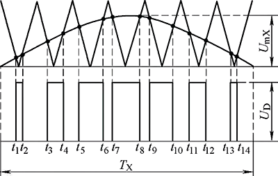 變頻器在進行正弦脈寬調制時,各脈沖的上升沿與下降沿時刻是由正弦波和等邊三角波的交點來決定的。如下圖: