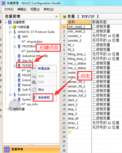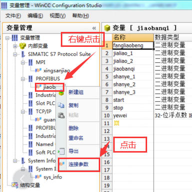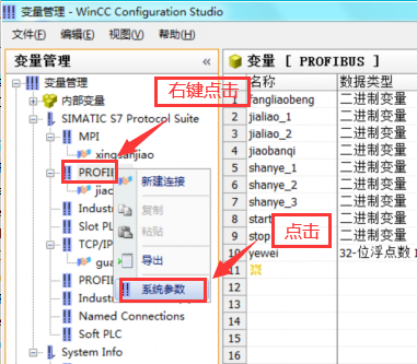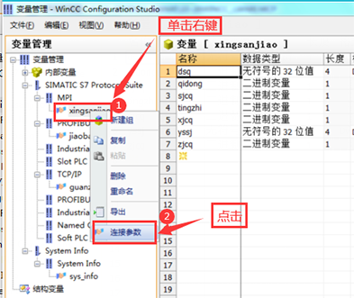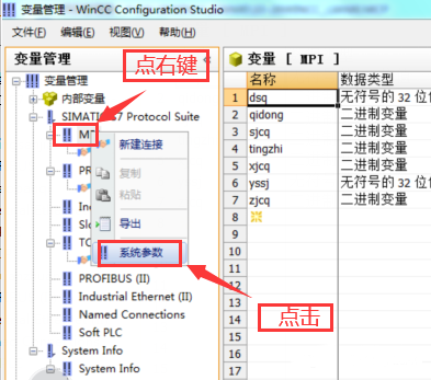 下面是對于外部變量與PLC通信連接的設置問題。以西門子300/400PLC為下位機為例,分為三種通信方式展開說明。分別是上位機WinCC與下位機的MPI通信、DP通信、以太網(wǎng)通信,以這三種通信方式為例,進行操作設置說明: