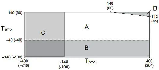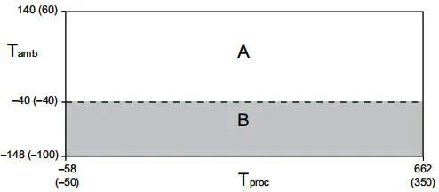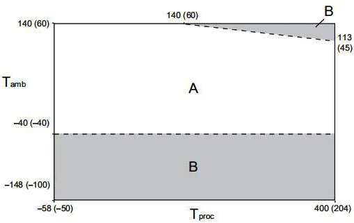 在所有情況下,艾默生質量流量計電子部件不能在環境溫度低于-40°C或者高于60°C的環境溫度下使用。艾默生質量流量計傳感器可以在如下溫度限制圖表所示的過程和環境溫度范圍內使用,如果過程條件接近灰色區域,請咨詢艾默生公司。