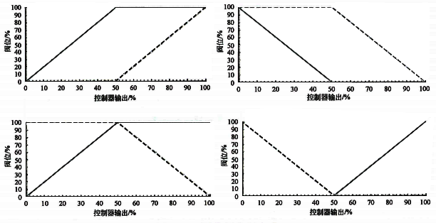 PID控制器分程動作根據(jù)調節(jié)閥特性和控制要求有多種形式,圖2是常見的四種調節(jié)閥分程方式。在實際應用中也有交接點附近重疊或者死區(qū)分離的情況。特殊情況下也有最終控制元件在整個范圍內部分有最小或最大開度。