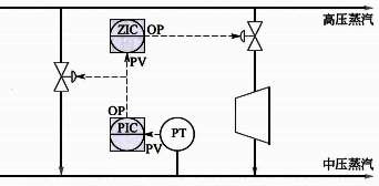 圖3的中壓蒸汽壓力會(huì)首先使用減溫減壓閥進(jìn)行快速控制,然后通過閥位控制調(diào)節(jié)透平在保證中壓蒸汽精確控制的前提下進(jìn)行優(yōu)化節(jié)能。當(dāng)中壓蒸汽用量增加時(shí)中壓蒸汽壓力降低,壓力控制回路首先打開減溫減壓閥以快速維持中壓蒸汽穩(wěn)定,當(dāng)減溫減壓閥開度超過閥位控制設(shè)定值時(shí),閥位控制器會(huì)緩慢開大到透平的蒸汽調(diào)節(jié)閥以更節(jié)能方式產(chǎn)生中壓蒸汽,然后壓力控制會(huì)減小減溫減壓閥的開度以維持中壓蒸汽。反之亦然。