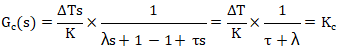 所以當λ=τ,閉環的設定值跟蹤會發生超調。此時閉環傳遞函數并不是期望的一階純滯后響應,這是純滯后的近似造成的,這也是Lambda整定方法推薦的最強控制作用。同理,當λ=2τ時,閉環設定值跟蹤不振蕩。