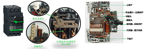 iC65微斷和GV2ME斷路器都屬于熱磁式斷路器,過載保護都是基于雙金屬片在過載電流發(fā)熱彎曲后推動脫扣機構(gòu)動作,下圖為二者的內(nèi)部結(jié)構(gòu):