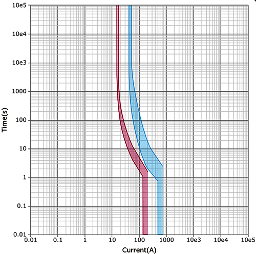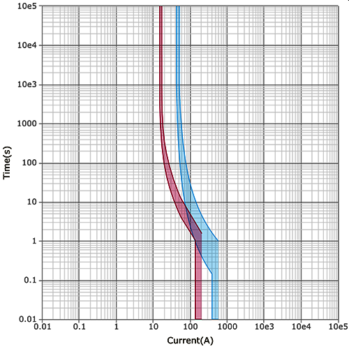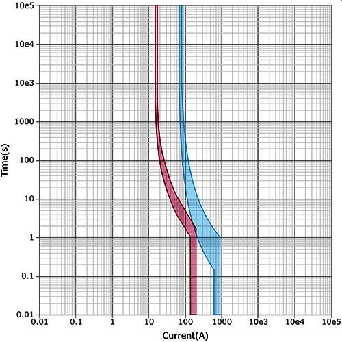 我們用施耐德在線選擇性曲線軟件,校驗iC65N-32A-D(藍色曲線)和GV2ME16C(紅色曲線)之間的選擇性,會發(fā)現(xiàn)在91A左右的過電流處,兩款斷路器都會動作,二者之間并無選擇性。