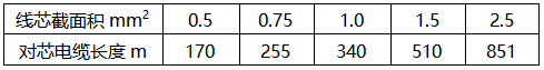 結合線芯截面積選用原則c的要求,截面積與敷設長度的選用推薦值如下表。