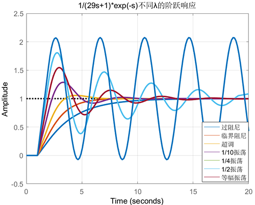 如果被控對象是一個τ/T=29/1的純滯后主導對象使用不同λ的閉環階躍響應見下圖。選擇不同λ可以實現從過阻尼到等幅振蕩的所有閉環響應。