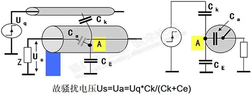 圖2中的干擾源是Uq,通過分布電容Ck耦合到平行布線電纜的屏蔽層上的A點,然后又通過屏蔽層與通信電纜的分布電容C耦合到電纜上的a點,Ce是屏蔽電纜與地間的分布電容,最后耦合到a點的干擾電壓為:Ua=Uq*Ck/(Ck+Ce)(注:前提是有一定的頻率)