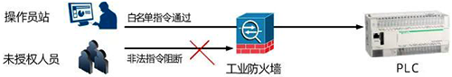 那么第2種方案,在工控設(shè)備前部署安全防護(hù)設(shè)施是目前比較可行的防護(hù)方案。通過(guò)在PLC前部署工業(yè)防火墻,來(lái)對(duì)PLC設(shè)備進(jìn)行安全防護(hù)的功能,如下圖所示: