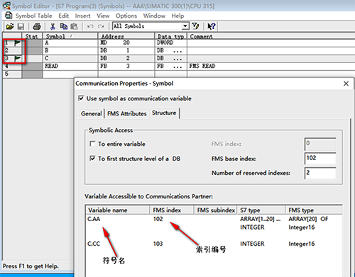 那我們先了解一下PROFIBUS-FMS通信服務是怎么實現的。FMS是采用主從方式,主站通過“讀”、“寫”指令與從站進行數據交換,由于各廠家地址區定義的差異性,例如西門子有DB、M、I、Q等地址區,但是別人家不一定是這樣呀,那就采用符號名的方式,給PLC變量命名一個符號名稱,或者采用INDEX方式,給變量一個編號,例如101、102等。S7-300/400被讀寫的變量需要在符號表中一一定義。