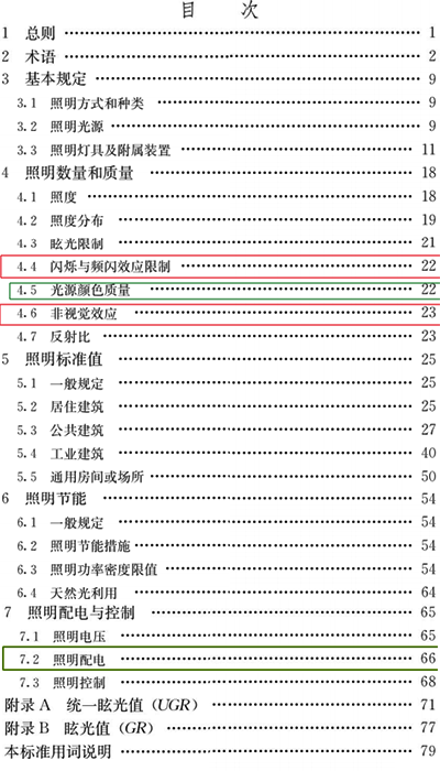新增:在目次中可以看到,第四章中的4.4閃爍與頻閃效應限制與4.6非視覺效應為新增內容,大家了解時需重點關注。