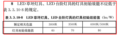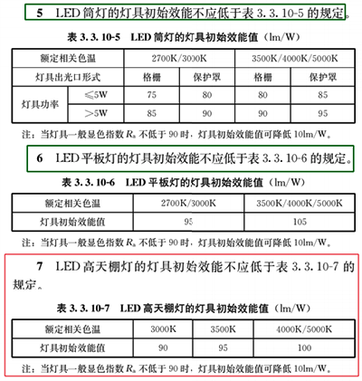 表3.2.6-1與表3.2.6- 2中分別對LED燈具不同色溫的初始光效值給出相應的規定,對于顯色指數Ra不低于90的燈具,可降低10lm/W,同時還對LED細分為非定向與定向2類。