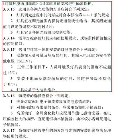 我們在選擇燈具時必須符合上面的這些條款,尤其新標準中3.3.12這一條,當我們選用傳統光源的燈具時,其表面溫度一般都會高于70度,所以我們一定要按照GB55016 《建筑環境通用規范》中的要求進行隔離保護。