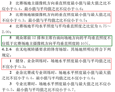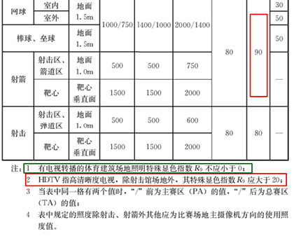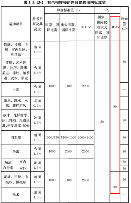 表5.3.13-2 有線電視轉播的體育建筑照明標準值中,取消了舊版色溫要求,HDTV顯色指數由舊版Ra>80,改為90。