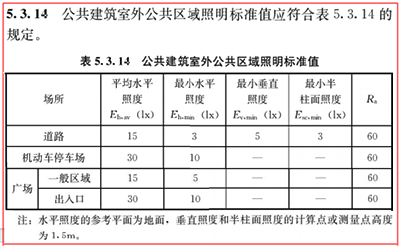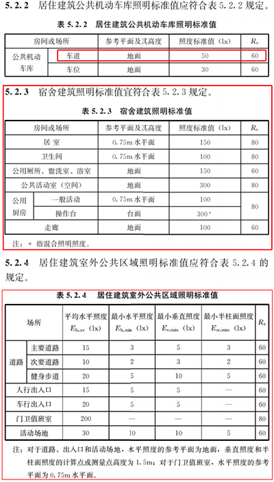 5.2.2與5.2.4增加了道路照明相關標準值,并細分為主要道路、次要道路、健身步道和公共機動車庫的車道四種場景