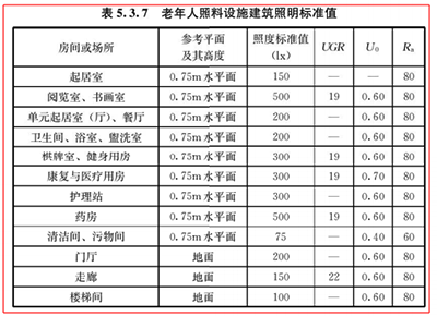 5.3.7新增了老年人照料設施建筑照明標準值,緊跟時事可為養老院,老人學校等老年人項目、活動作為參考的相應標準。