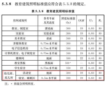 5.3.8 教育建筑照明標準中新增了幼兒園、托兒所不同區域的照明標準,但這些標準中有些標準值遠低于地方標準中的對應值,所以在接受此類設計時一定要結合當地照明標準進行設計。