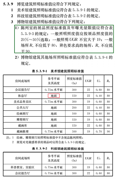 5.3.9-1美術館建筑照明標準值表中,將舊標準的休息廳參考平面改為地面。