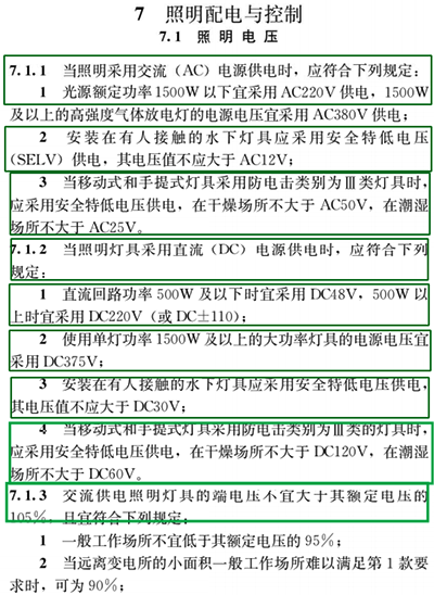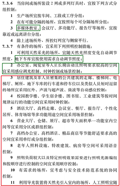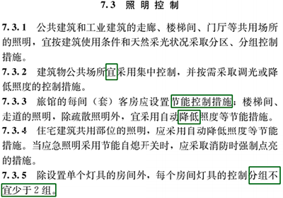 這些條款中改動的地方較多,比如7.1 照明電壓,7.3 照明控制等細節方面的調整;新增內容包括不限于7.3.7 中增加了公眾建筑走廊和樓梯間、校園、酒店大廳、老人空間的照明控制措施、7.3.9 中特定場所的照明控制等等內容,這些都是與舊標準有所不同,所以建議大家還是好好看一看,重點關注,相信一定是有很多收獲的。