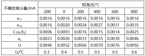 3.3 對測量范圍-200~800℃的不帶傳感器的熱電阻的溫度變送器在各校準點的的測量不確定度的評定見表6。