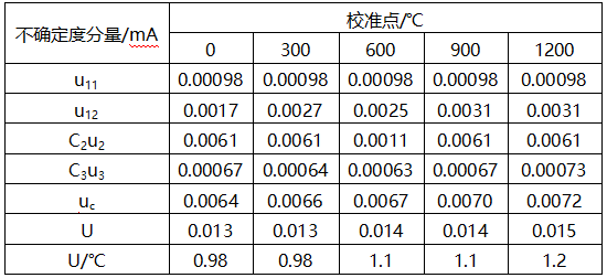 (5)對測量范圍0-1200℃的不帶傳感器的配K型熱電偶的溫度變送器的測量不確定度的評定見表4。