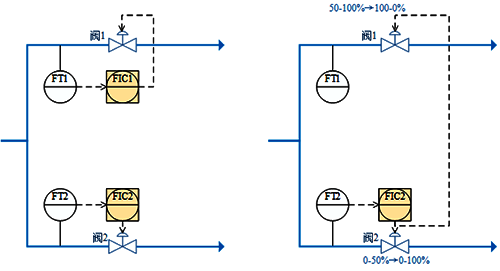 2、理解設計意圖:左邊方案兩個流量設定值控制、右邊方案流量閥1全開先用閥2控制,閥2全開后用閥1控制。