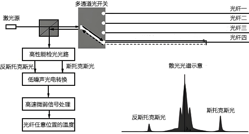 通過對拉曼散射信號和時域反射時間的精確檢測即可準確、快速地獲得整條感溫光纖的溫度分布信息。