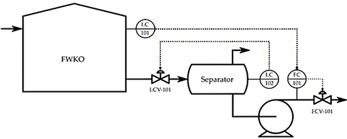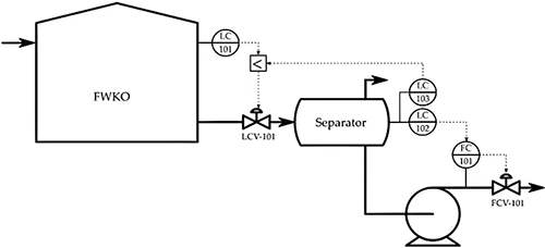 對于FWKO罐,液位為控制變量,出口流量閥LCV-101為操縱變量。對于分離器,由于泵的非線性動力學(xué),采用串級液位(LC-102)輸出流量(FC-101)控制回路來改進(jìn)液位控制。