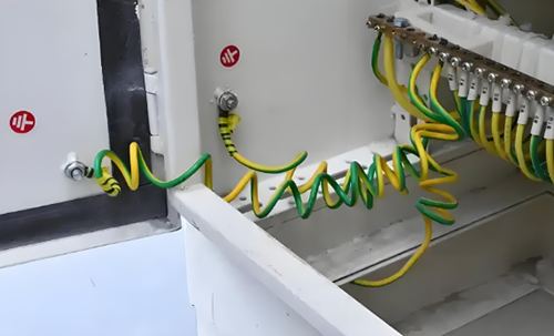 5.1.1 柜、臺、箱的金屬框架及基礎型鋼應與保護導體可靠連接;對于裝有電器的可開啟門,門和金屬框架的接地端子間應選用截面積不小于4mm2的黃綠色絕緣銅芯軟導線連接,并應有標識。