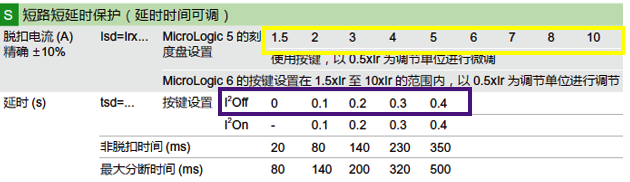 3、圖5脫扣曲線中黃色方框內代表短路短延時保護整定電流范圍,紫色方框代表延時時間的可調值。