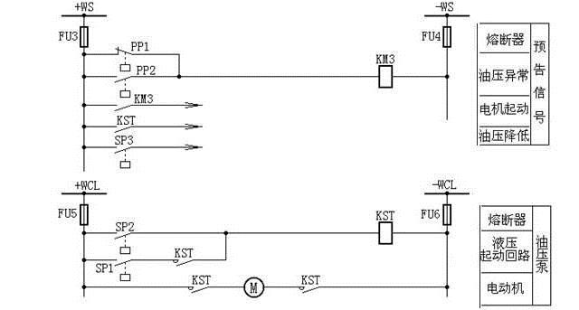 當壓力低于15.72MPa,3SP3觸點閉合,發出油壓降低信號;當液壓低于16.72MPa時,觸點SP1、SP2閉合,啟動油泵打壓,當油壓上升到18.63 MPa時,SP1、SP2均斷開,油泵停止打壓。當壓力低于9.8MPa或高于24.5MPa時,由壓力表的觸點PP1、PP2啟動KM3發出壓力異常信號,還可以利用KM3常閉觸點閉鎖油泵電動機啟動接觸器的啟動回路(圖中未示出),防止當油壓降到零時,啟動油泵可能造成斷路器的慢分事故。