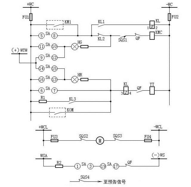 圖4中:+WC、-WC為控制母線;FU1、FU2為熔斷器,R1-10/6型,250V;SA為控制開關,LW2-1a.4.6a.40.20.20/F8型;HG為綠色信號燈具,XD2型,附2500Ω電阻;HR為紅色信號燈具,XD2型,附2500Ω電阻;KL為中間繼電器,DZB-115/220V型;KMC為接觸器; KOM為保護出口繼電器;QF為斷路器輔助開關;WCL為合閘小母線;WSA為事故跳閘小母線;WS為信號小母線;YT為斷路器跳閘線圈;YC為斷路器合閘線圈;FU1、FU2為熔斷器,RM10-60/25 250V;R1為附加電阻,ZG11-25型,1Ω;R2為附加電阻,ZG11-25型,1000Ω;(+)WTW為閃光小母線。
