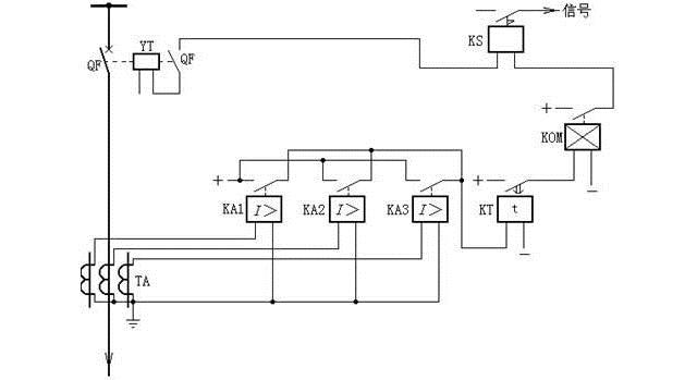 如圖13,當被保護線路發生故障時,短路電流經電流互感器TA流入KA1—KA3,短路電流大于電流繼電器整定值時,電流繼電器啟動。因三只電流繼電器觸點并聯,所以只要一只電流繼電器觸點閉合,便啟動時間繼電器KT,按預先整定的時限,其觸點閉合,并啟動出口中間繼電器KOM。KOM動作后,接通跳閘回路,使QF斷路器跳閘,同時使信號繼電器動作發出動作信號。由于保護的動作時限與短路電流的大小無關,是固定的,固稱為定時限過電流。