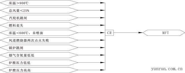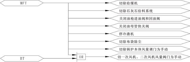 主燃料跳閘(MFT)主要指鍋爐的安全運行條件不滿足,或爐內(nèi)燃燒工況惡化,而發(fā)出相應指令快速切斷所有通往爐膛的燃料并引發(fā)必要的聯(lián)鎖動作,以保護鍋爐本體、其他設備和人員的安全。CFB鍋爐的MFT不同于煤粉爐的MFT,這是因為即使切斷所有燃料輸入,CFB鍋爐內(nèi)可能還存有大量未燃燼的燃料,并隨著物料循環(huán)繼續(xù)燃燒,所以對于CFB鍋爐來說,MFT并不等同于停爐。