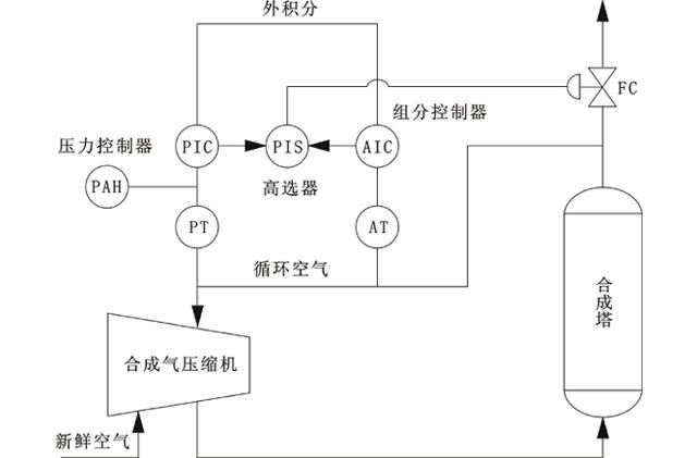 發(fā)生系統(tǒng)壓力高報警,應(yīng)立即在現(xiàn)場用手輪操作,并首先判斷壓力變送器、報警器等無故障后,進(jìn)一步檢查壓力控制器輸出是否取代組分控制器輸出值。若壓力控制器工作正常,且輸出值已達(dá)正常取代值而未通過高選器取代組分控制器,則判斷為高選器故障,若為壓力控制器故障,則迅速將此控制器切至手動,不斷調(diào)大輸出值,控制合成系統(tǒng)壓力。