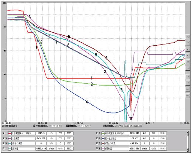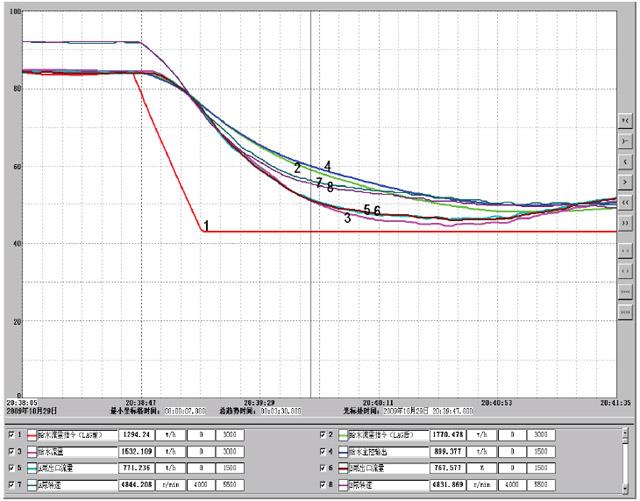 由于實(shí)際給水流量已經(jīng)瞬間減少了一半,協(xié)調(diào)給水與燃料特性的滯后時(shí)間LAG只需要穩(wěn)定運(yùn)行泵在最高轉(zhuǎn)速運(yùn)行即可,因此,LAG盡可能在大些,否則在給水指令的迅速下降過程中,由于前饋的作用,反而會(huì)降低給水泵的轉(zhuǎn)速。